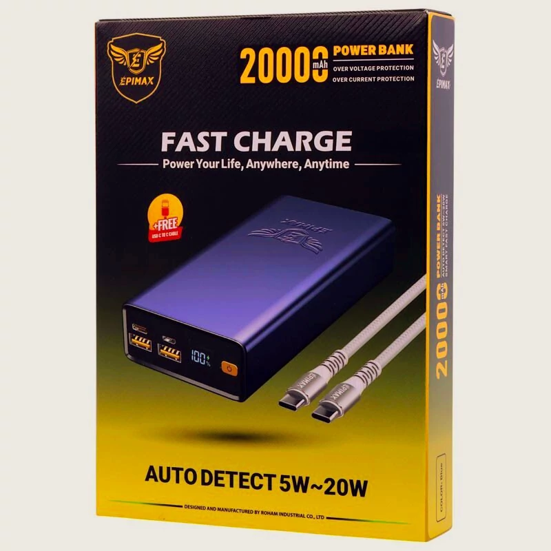 پاور بانک فست شارژ اپی مکس EP-213 20W ظرفیت 20000 میلی آمپر ساعت بهره مند از 2 درگاه خروجی USB با حداکثر توان خروجی 18 وات و یک عدد تایپ سی (مشترک) با حداکثر توان خروجی 20 وات و یک عدد پورت ورودی میکرو یو اس بی
